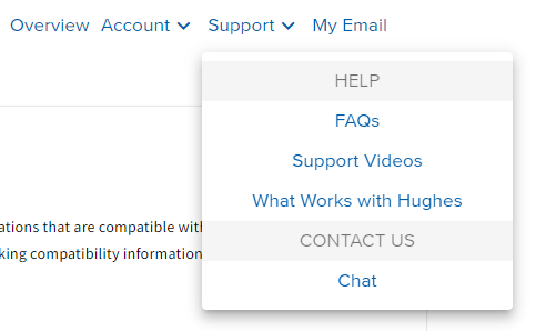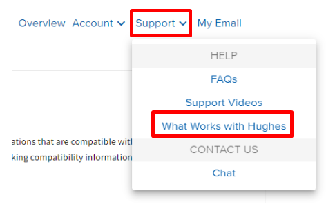 What Works with Hughesnet is a resource page to finding devices and configurations that are compatible with Hughesnet. You can find this by selecting the Support Dropdown menu and selecting “What Works with Hughesnet.”