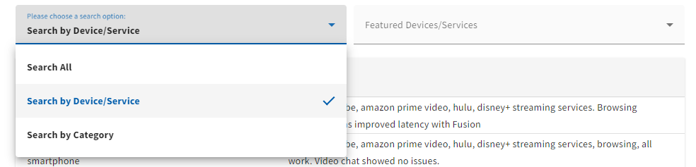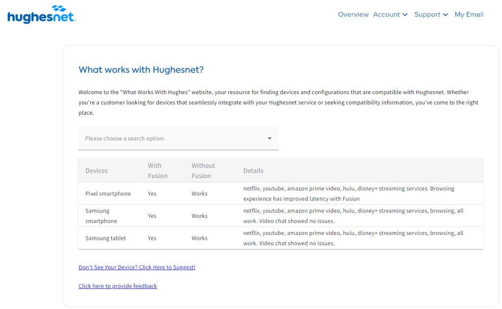 If you want to know what works with Hughesnet, simply search for your device or service by typing in the search or using the drop-down menus to locate the item.
